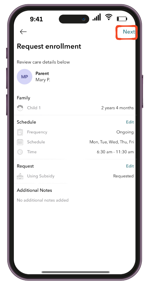 5. Review the care information provided by the parent, edit any schedule changes, or any additional requests sent by the parent, once everything looks good click Next.