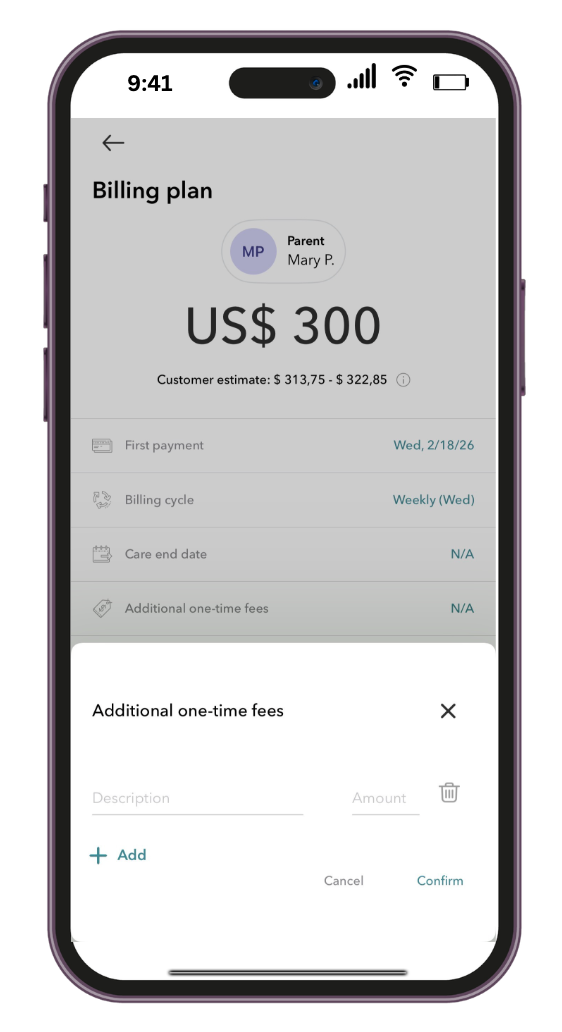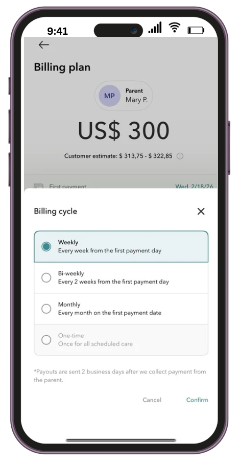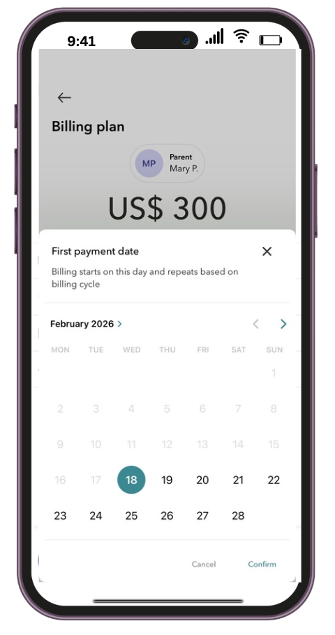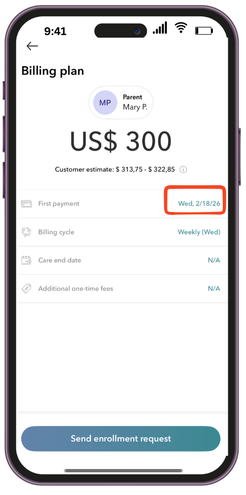 Please select when you would like to collect your first payment. Our system defaults to collecting one week in advance. If you would like to align it with the parents' payment schedule, you can choose a different date that works better for you.