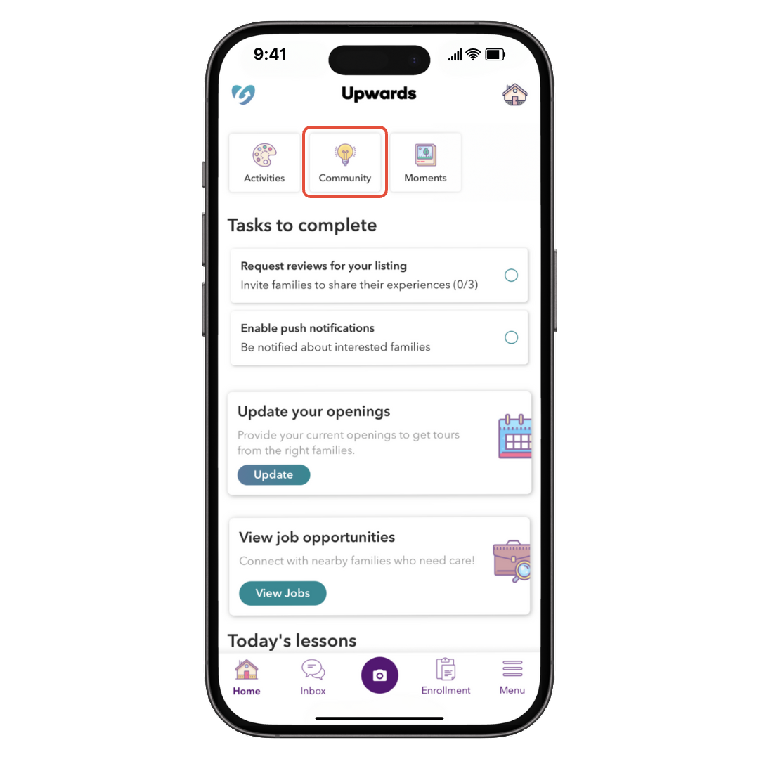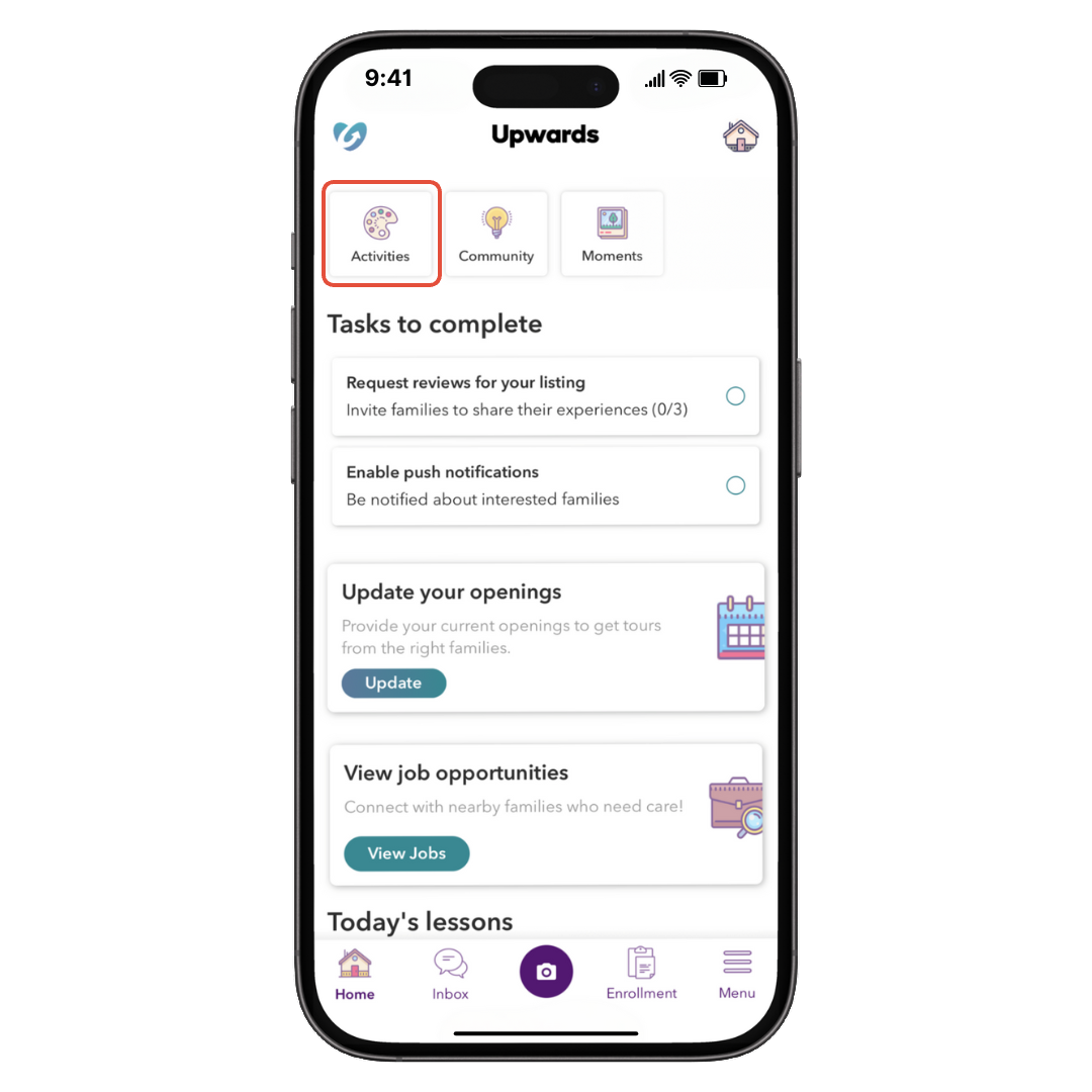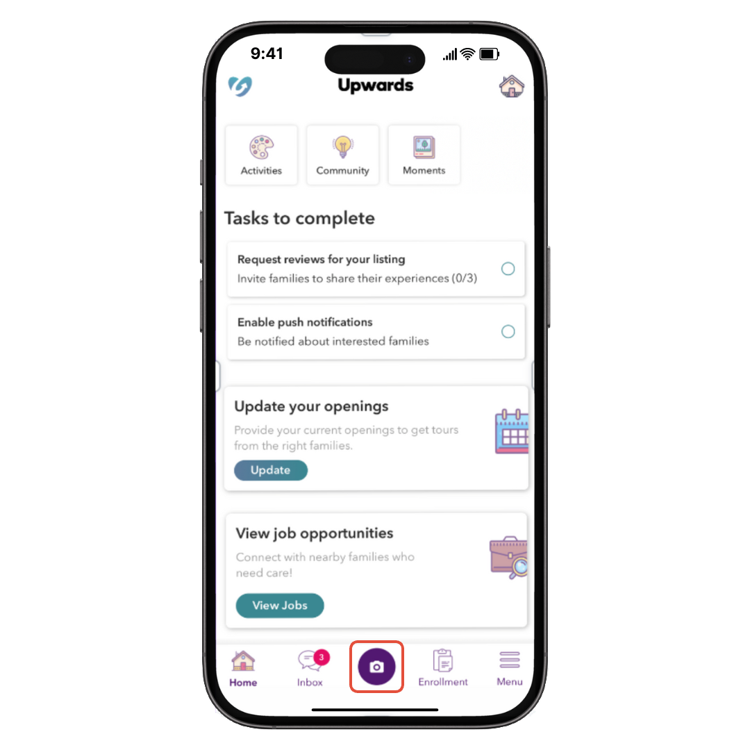 A través de la app Upwards, puedes capturar y compartir los momentos especiales del día de cada niño. Compartir momentos ayuda a los padres a mantenerse conectados con el crecimiento y desarrollo de sus hijos, incluso cuando están lejos. Además, publicar regularmente mejora la clasificación de tu programa en la app.